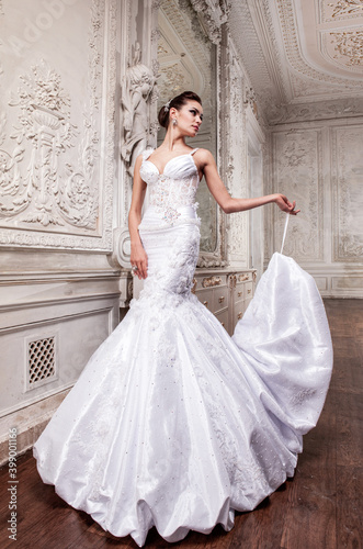 Beautiful bride in a white wedding dress in a light old classic interior