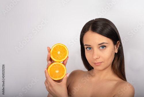 beautiful brunette girl, blue eyes, in her hand an orange, white background, close-up