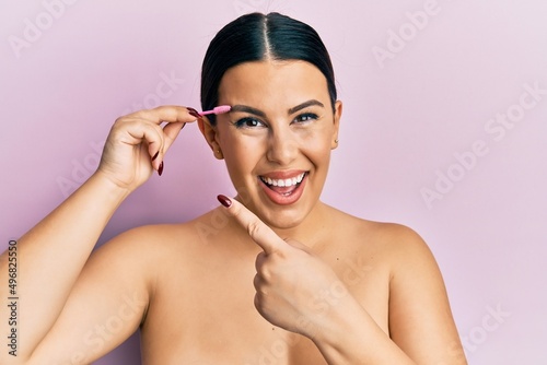 Beautiful brunette woman brushing eyebrow with brush smiling happy pointing with hand and finger