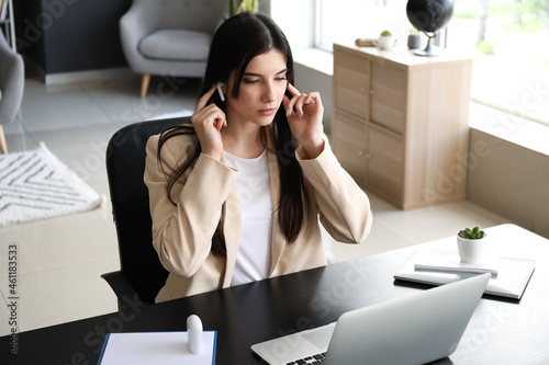 Beautiful businesswoman putting on earphones before video chatting in office