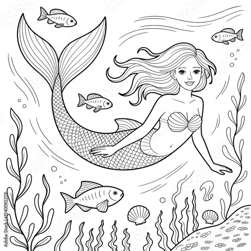Beautiful cartoon illustration of a swimming mermaid with flowing hair, a shell bikini, fish, seaweed, and seashells in the ocean, perfect for coloring pages