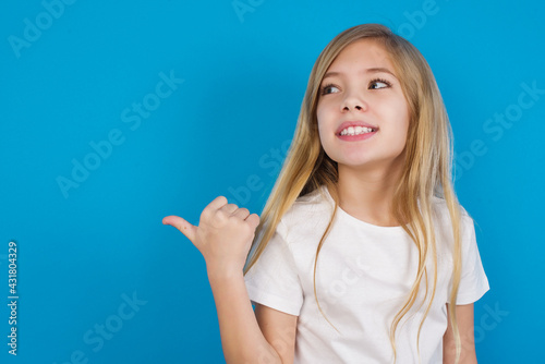 beautiful Caucasian little girl wearing white T-shirt over blue background points away and gives advice demonstrates advertisement