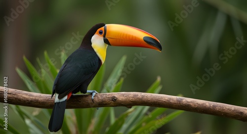 Beautiful channel billed toucan ramphastos vitellinus bird perched on branch in natural habitat view on transparent background