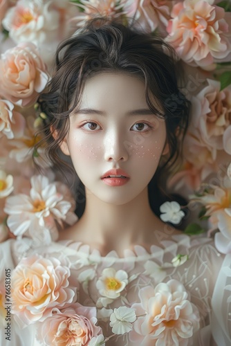 Beautiful Chinese female model with large flowers in the background. Generative AI.