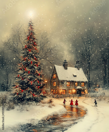 Beautiful Christmas tree and old English house, kids playing with snow. Christmas card, background