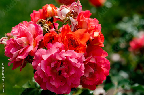 beautiful close up of several red and orange rose flower heads of the german gebrueder grimm rose