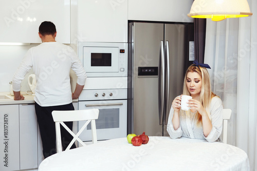 Beautiful couple drinking tea, sitting in the kitchen at home