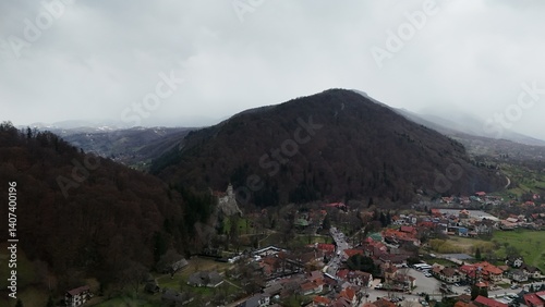 Beautiful drone picture of the Bran castle, Transylvania, Romania, Carpathians, during a grey spring day, located between two hills and the village of Bran.