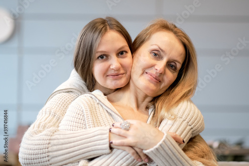Beautiful family of mother and daughter together, hugging and kissing at home. senior mom and her adult daughter are hugging, looking at camera and smiling