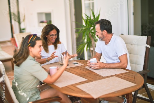 Beautiful family sitting on terrace drinking cup of coffee speaking and smiling