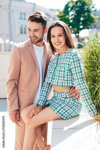 Beautiful fashion woman and her handsome elegant boyfriend in beige suit. Sexy brunette model in summer clothes. Fashionable smiling couple posing in street Europe. Brutal man and female outdoors