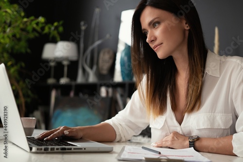Beautiful Female Data Analyst sitting at the Table Works on a Laptop. Stylish Woman in the Modern Office Environment.
