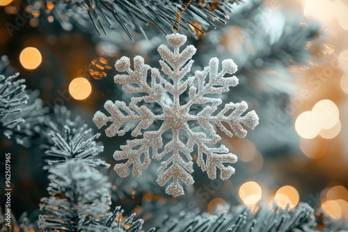 Beautiful festive snowflake decoration on the Christmas tree. Close-up. Beautiful Christmas background. The concept of decorations and decor for the new year. with generative ai