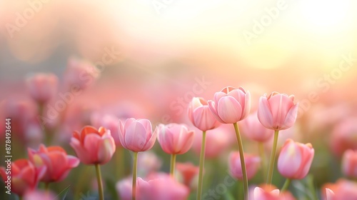 Beautiful field of pink tulips in full bloom under a soft, warm sunlit glow, creating a serene and peaceful spring landscape.