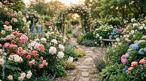 beautiful garden with flowers and stone path