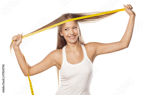beautiful girl measured her hair with a measuring tape