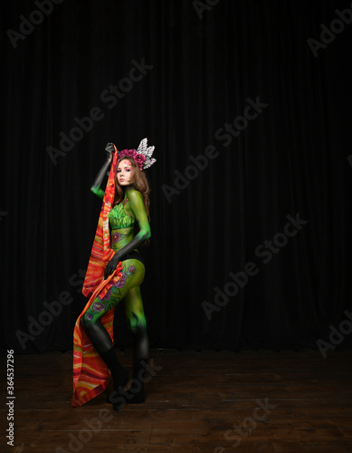beautiful girl painted with green paint and burgundy peonies posing in different poses with an orange pareo