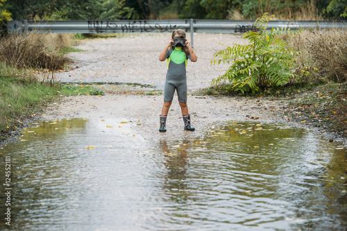 beautiful girl playing in the puddle of water with neoprene