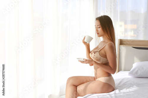 Beautiful girl sitting and drinking coffee in the bedroom.