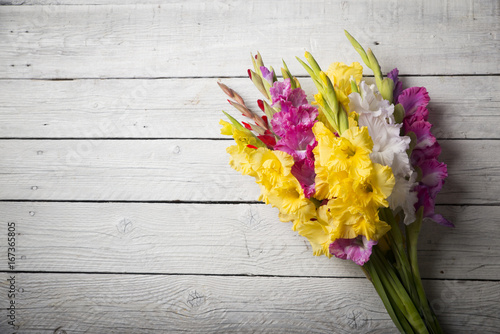 Beautiful gladiolus on wooden background