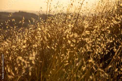 Beautiful idyllic summer landscape of Toscana, with many mediterranean plants and field grasses with a landing sun behind it. Sunny meadow on evening or morning in Italy. Vacation, recreation mood.