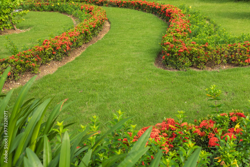 Beautiful Images of a garden with Landscaping Grass and Flowers.