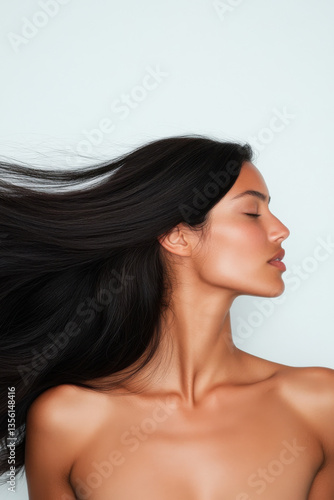 Beautiful latin woman showing long healthy hair flowing in wind