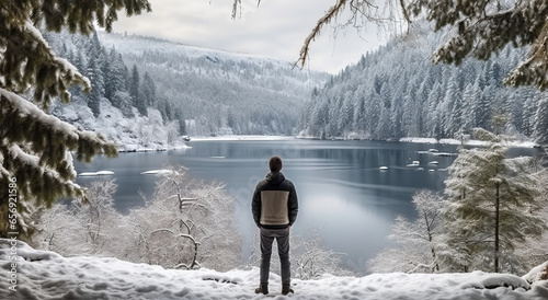 Beautiful man on the mountain top in winter, on the beautiful mountains admiring the lake. Colorful winter landscape. Travel and Tourism