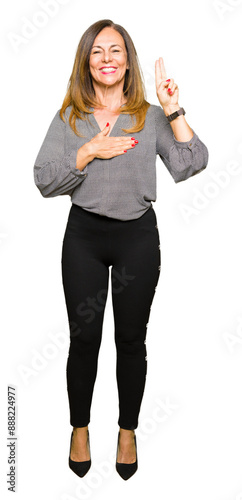 Beautiful middle age business woman Swearing with hand on chest and fingers, making a loyalty promise oath