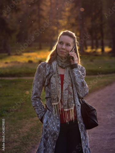 Beautiful middle-aged woman talking on the phone in the evening in nature