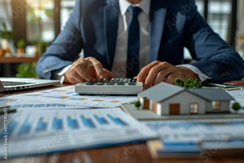 Beautiful midsection of a businessman calculating invoice with an energy efficient chart on a house model in the office.