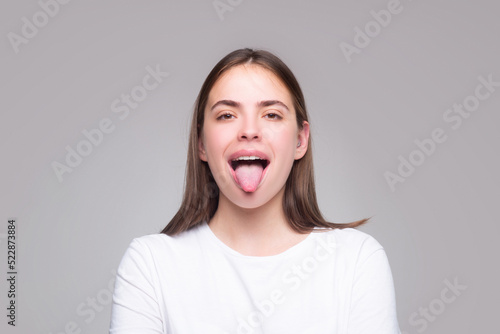 Beautiful modern model shows tongue. Model with sticking tongue out. Girl showing tongue. Emotional mouth with licking lips. People emotions lifestyle.
