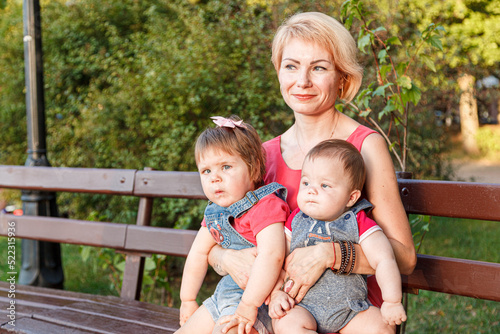 beautiful mother with her daughter and son are sitting on a bench in the park in the summer