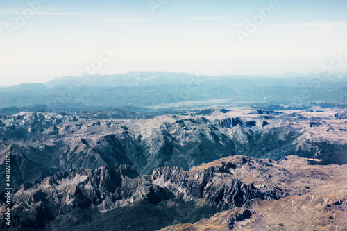 Beautiful mountain landscape background. Group of mountains view from the great height airplane porthole. High altitude мassif
