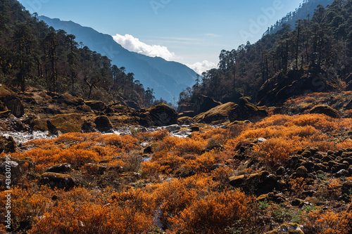 Beautiful mountains and forest in autumn season. Mera peak trekking trail in Himalaya mountains range, Nepal