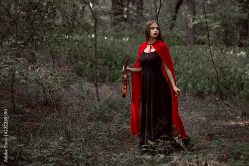 beautiful mystic girl in black dress and red cloak holding violin in forest
