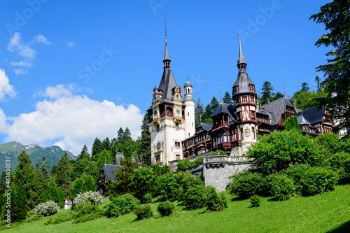 Beautiful neo-Renaissance building of Peles Castle (Castelul Peles) near Bucegi Mountains (Muntii Bucegi) in a sunny summer day in Sinaia town, Romania .