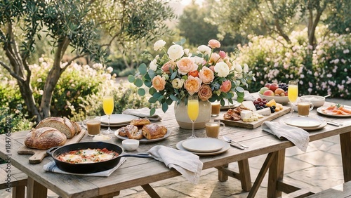 Beautiful outdoor brunch table set with fresh flowers, assorted pastries, fruits, and beverages, creating a warm and inviting atmosphere for gatherings and celebrations in a garden setting