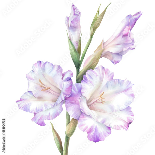 Beautiful pastel gladiolus flowers with delicate petals and green stem