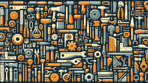 Beautiful patterned wallpaper with neatly arranged equipment objects in a yellow and black color combination