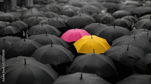 Beautiful photo of Single yellow pink amidst many black umbrellas