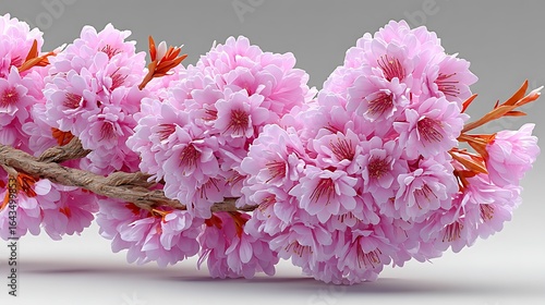 Beautiful Pink Cherry Blossom Branch With Lush Blooming Flowers Against Soft Gray Background