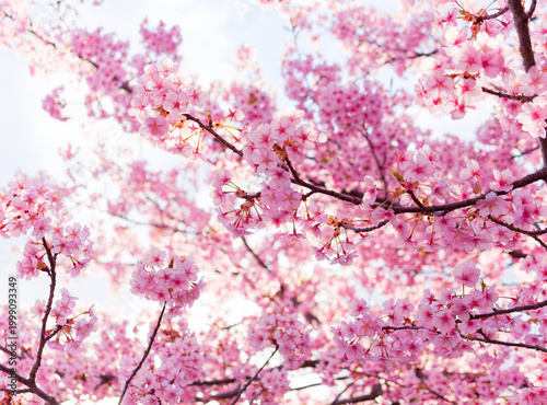 Beautiful Pink Cherry Blossoms and Sunlight in Spring Blue Sky