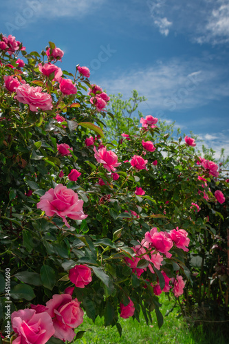 Beautiful pink roses on the rose garden in summer with blu sky in background.