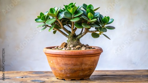 Beautiful potted succulent plant on wooden table with soft background