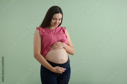 Beautiful pregnant woman on color background