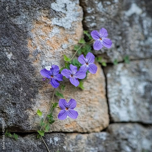 Beautiful purple flowers growing on an ancient stone wall in a natural setting during springtime