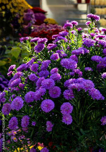 Beautiful purple flowers in a garden in soft sunny light.