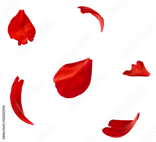 Beautiful red petals of red Peony flower falling in the air isolated on white background. High resolution. Zero gravity or levitation concept.