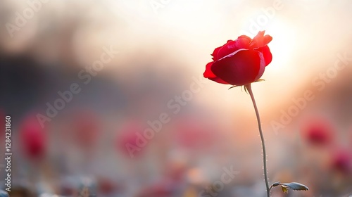 Beautiful red rose blooming in a tranquil setting during sunset capturing nature's elegance : Generative AI
